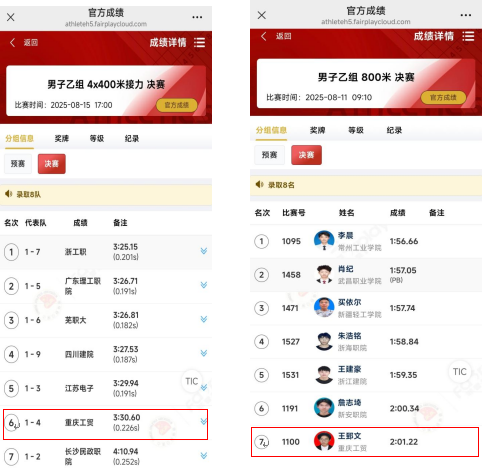 在为期六天的激烈角逐中,我校田径队在领队范全明及教练员张小瑜、王永涛、陈剑波、韩英的带领下,田径队表现优异:荣获男子4x400米接力决赛全国第六名(运动员汤朝州、吴天豪、王郅文、吴明菲);荣获男子800米决赛全国第七名(运动员王郅文)。以上两项成绩(4×400米接力:3分26秒55;800米:1分58秒23)在预赛中均再次刷新我校田径纪录。健儿们以出色的表现生动诠释了“更快、更高、更强、更团结”的体育精神,充分彰显了重工贸学子的青春风采。