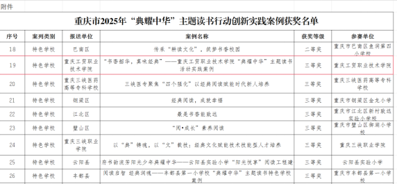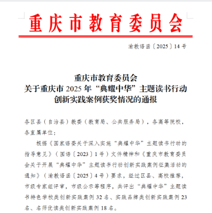 近日,重庆市教育委员会通报了重庆市2025年“典耀中华”主题读书行动创新实践案例获奖情况,马克思主义学院(基础教育学院)推荐报送的《“书香韶华,真味经典”——重庆工贸职业技术学院“典耀中华”主题读书活动实践案例》在“特色学校”案例类别中获市级三等奖。
